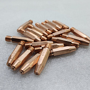Усиленный контактный наконечник из сплава меди, хрома и циркония (CuCrZr) для полуавтоматической сварки. Предназначен для работы со сплошной и порошковой проволокой диаметром 1.0–1.2 мм. Длина 35 мм и резьба М8×1.0 обеспечивают совместимость с горелками стандарта RF-45 и аналогами.
